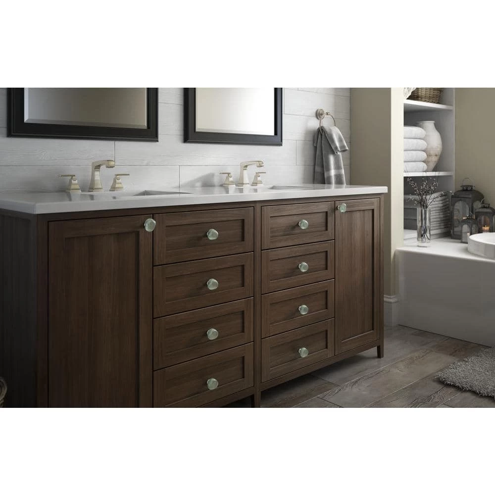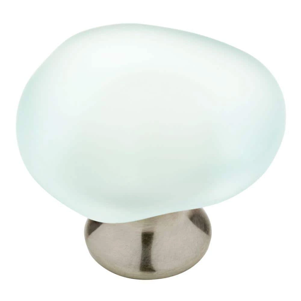 - Classic satin nickel finish with natural aqua sea glass complements most wood finishes