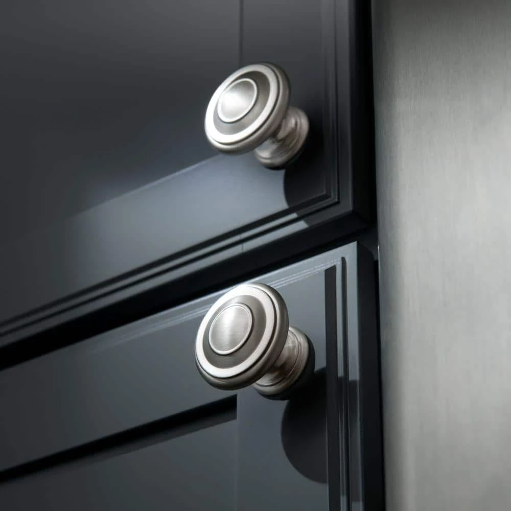 Make a bold statement when you display the Liberty Harmon 1-3/4 in. Knob. This stylish piece of hardware possesses a sturdy base with intricate ring designs on every layer of this classy piece of hardware. The rear-mounting feature creates an easy installation experience.