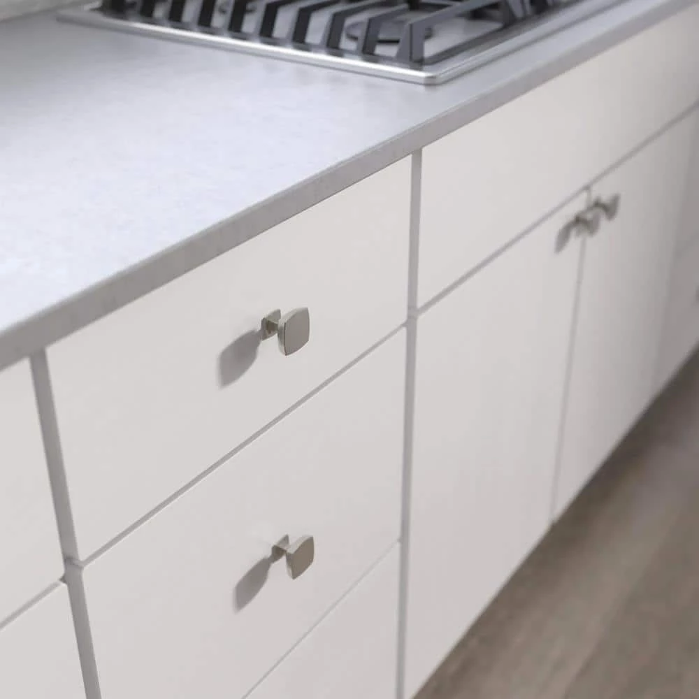 - Timeless satin nickel finish coordinates with a wide variety of cabinet finishes