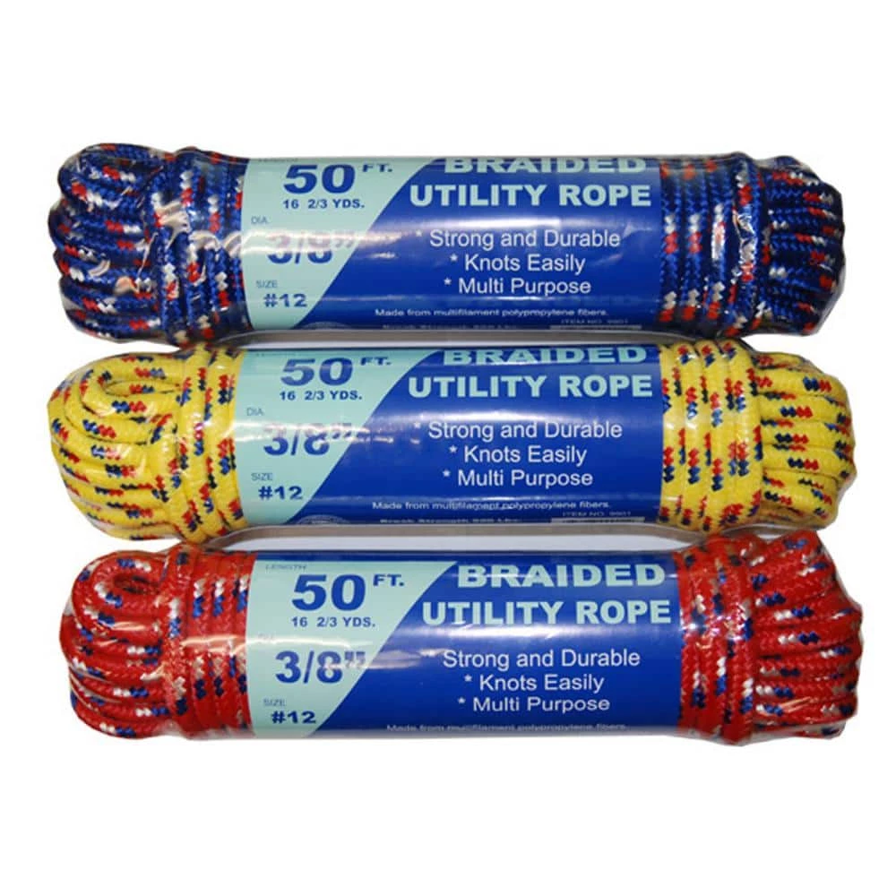 A braided polypropylene with poly core. This is a great utility rope for hundreds of uses for hunters, campers, hikers, homeowners, etc. They come in assorted colors with tracers. There is red, blue, green and yellow. You will not be able to choose the color.