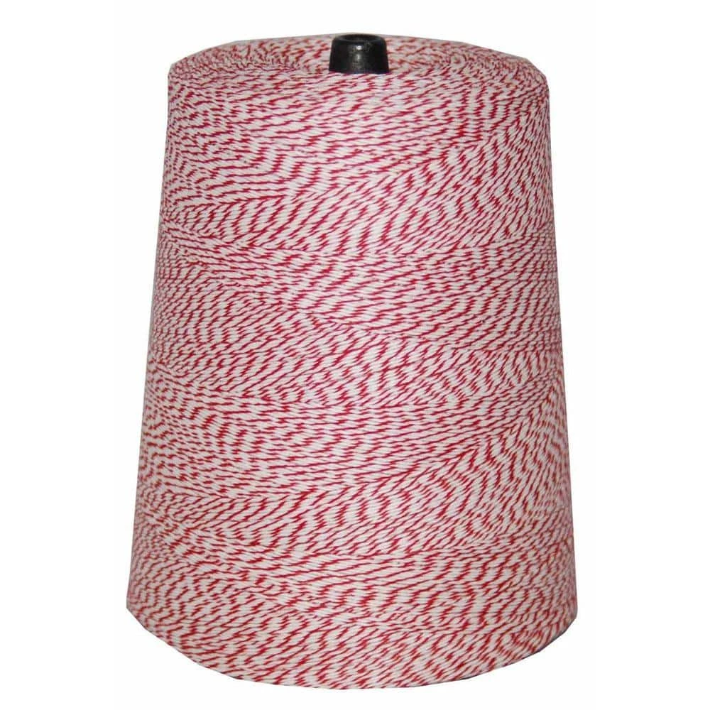 Our variegated cotton twine or bakery twine is made from a blend of cotton and polyester fibers. The variegated twine has one red strand and 3 white strands. This twine is used as a bakery twine and can be used for many craft projects. This is the same twine the sells for 10x as much per foot.